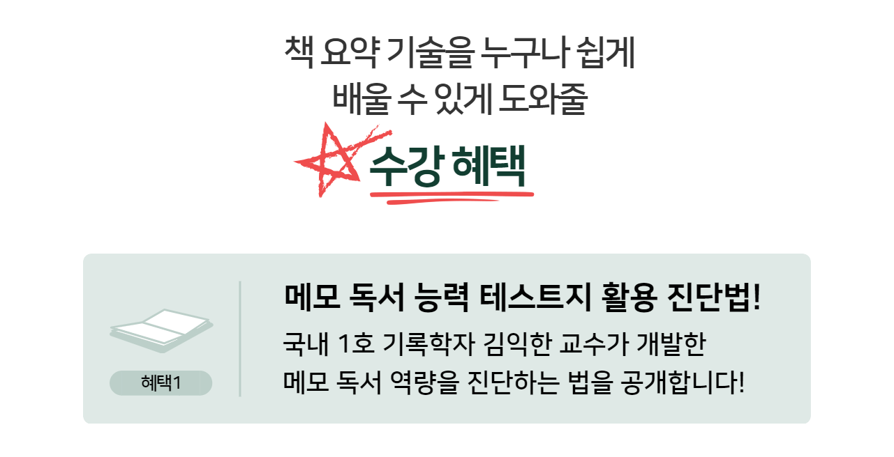 ![]() | STEP 2 메모 독서 능력 진단 테스트! 나의 메모 독서 능력이 어느 정도인지 궁금하지 않으신가요? '메모 독서법 분야 최고 권위자'이며 '국내 1호 기록학자' 김익한 교수가 다년간 연구한 교육 경험으로 새롭게 개발한 진단 도구를 만나 보세요! (본내용은 2강. 나의 메모 독서 능력에서 더 정확한 진단이 가능합니다!) |