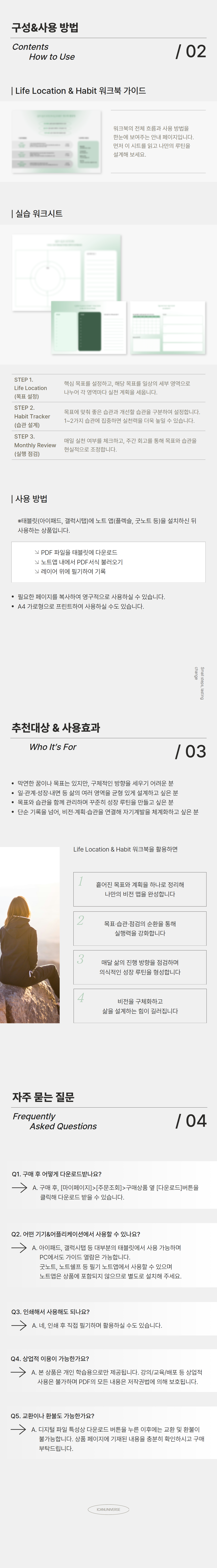 일상의 여러 영역을 체계적으로 조망하며 현실적이고 지속 가능한 성장 시스템을 구축하도록 돕는 가이드&실습 PDF입니다. 삶의 목표 명확화 → 목표를 이루기 위한 습관 관리 → 실행 점검의 흐름을 따라가며 당신의 목표를 일상 속 루틴으로 만들어 보세요.