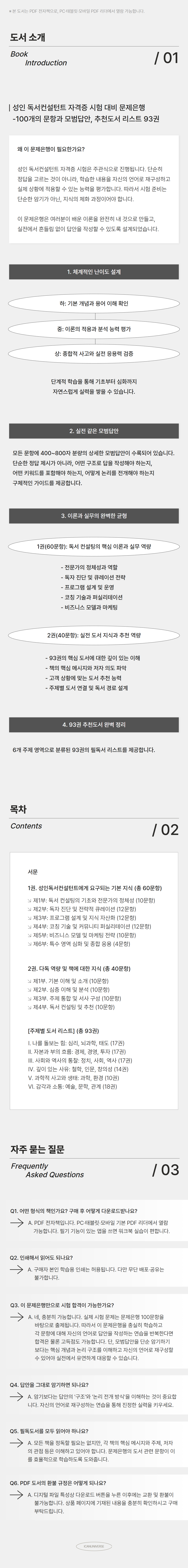 성인 독서컨설턴트 자격증 시험을 준비하는 여러분을 위한 완벽한 학습 솔루션입니다. 주관식 시험의 특성을 완벽히 반영한 100개의 엄선된 문항과 400~800자 분량의 상세한 모범답안, 그리고 실전에 바로 활용 가능한 93권의 추천도서 리스트까지. 단순 암기가 아닌, 지식의 체화와 전문성 내면화를 위한 체계적 학습 도구입니다.